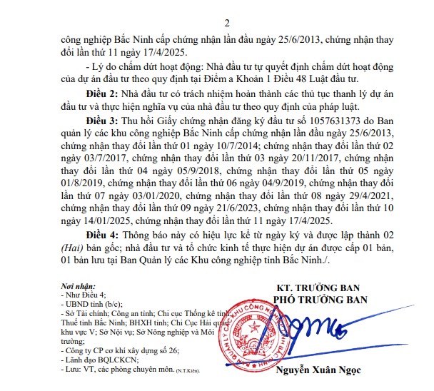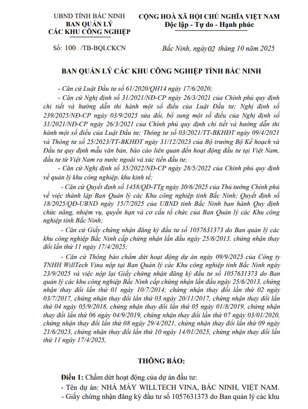 Thông báo số 100/TB-BQLCKCN về việc chấm dứt hoạt động của dự án đầu tư Công ty TNHH Willtech Vina